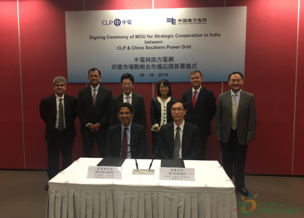 10月19日下午, 南方电网国际(香港)有限公司与中电印度公司在香港举行印度市场战略合作备忘录签约仪式。中电控股有限公司总监及中华电力有限公司副主席阮苏少湄、中电控股有限公司执行董事及财务总监Geert Peeters先生、南方电网国际有限责任公司董事长、南方电网国际(香港)有限公司董事长唐红键出席仪式见证双方备忘录的签署。