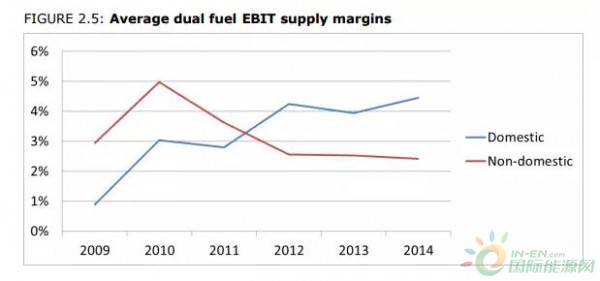 六大公司的息税前利润(EBIT)百分比,如下图所示。蓝线代表了居民用电市场的盈利水平,而红色代表了工商业用电的盈利情况。从图表中可以反映出两点: