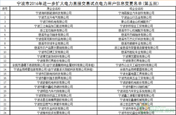附件:宁波市2016年进一步扩大电力直接交易试点电力用户信息变更名单(第五批)