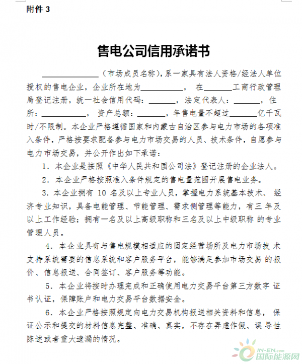 (三)内蒙古电力市场售电公司信息表(附件2);