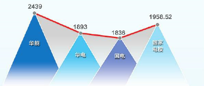 在经历了2012~2015“黄金四年”的“业绩置顶”后,2016年,受上网电价下调、煤价上涨、利用小时下降、水情变化、弃风弃光增大等因素影响,除国家电投集团逆势上扬,营业收入累计完成1958.52亿元,同比增加34.48亿元,增幅1.79%外,其他企业出现小幅下降,其中华能集团合并营业收入2439亿元,同比下降9.1%;华电集团销售收入1893亿元,同比下降4%;国电集团实现营业收入1836亿元。