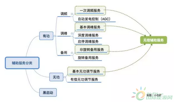 从提供服务的性质来说,可以分为有功、无功、黑启动三类,从是否为义务辅助服务来说,可以分为无偿辅助服务和有偿辅助服务。