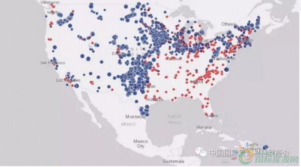 该地图展示了美国风电行业的发展历程。从1981年美国首个现代意义上的风能项目启动开始,而后在中部腹地(包括德克萨斯州、艾奥瓦州、俄克拉荷马州、堪萨斯州等)徐徐展开,直到2016年美国首个海上风电项目在罗德岛竣工。