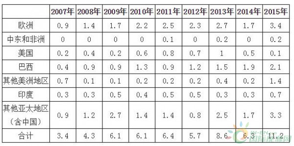 2015年全球生物质及垃圾发电累计装机容量与2014年相比增加了11.8%。其中欧洲、中国、巴西是增长的主要驱动力。欧洲仍是全球最大的生物质及垃圾发电市场,2015年累计装机容量达34.7GW,巴西和美国2015年生物质和垃圾发电累计装机容量分别为15.3GW及15GW,分列二、三位。