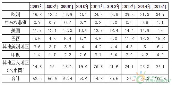 2007-2015年全球生物质及垃圾发电累计装机容量地区分布:GW