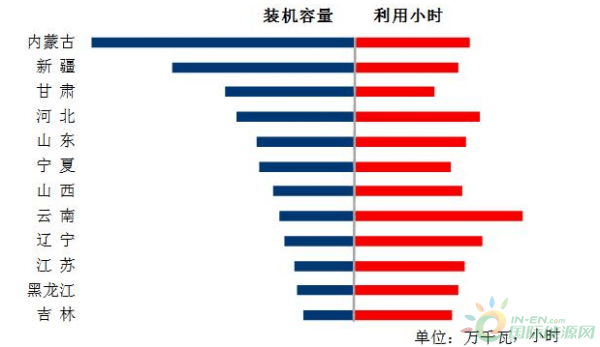 图6 1-7月份风电装机较多省份风电装机容量和设备利用小时