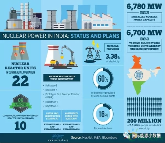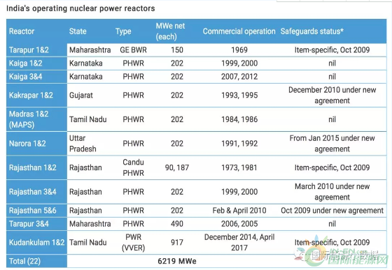 印度目前共有22个核电机组,总装机容量为6,780兆瓦,发电量占全国总发电量的3.38%。目前有6座核电机组在建,预计到2022年增加6,000兆瓦的核电装机,届时总装机为13,480兆瓦。