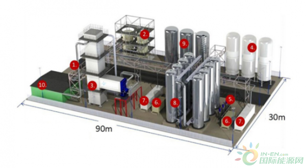 图2 储能容量为2.25/125MW的液态空气储能(LAES)的组件包括压缩机房、空气净化器、冷箱和冷膨胀机、液体空气存储器、低温泵、集装箱式电源涡轮机和发电机,2×10MW、热交换器容器、高级冷库、热水储存器、以及电气进口和开关室。