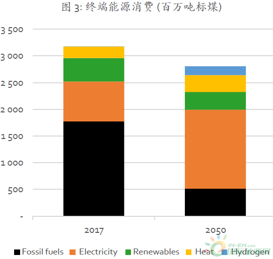 能源系统的核心将从燃煤过渡到电力。 低于2 °C情景中,终端部门的电气化率将从2017 年的24%提至2050年的53%;2050年全社会电力生产量较2017年将翻倍。可再生能源取代煤炭成为供电主力。