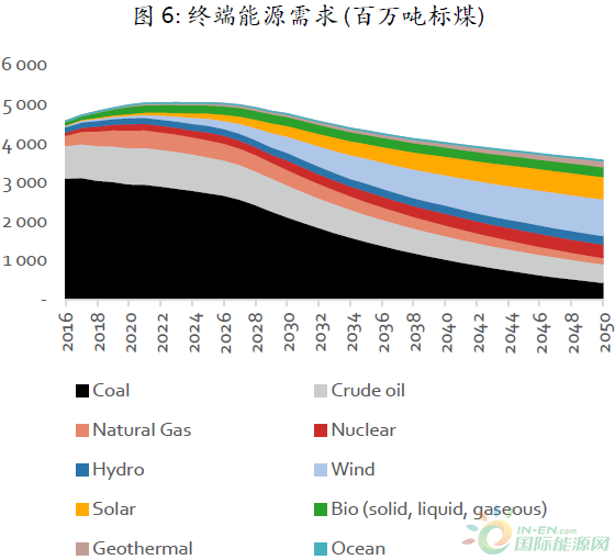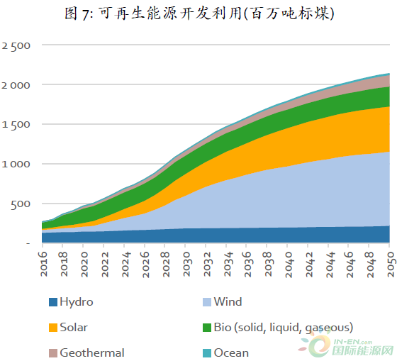 未来可再生能源供能主要集中在电力部门;太阳能与风能将主导电力供应(图7)。