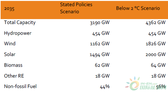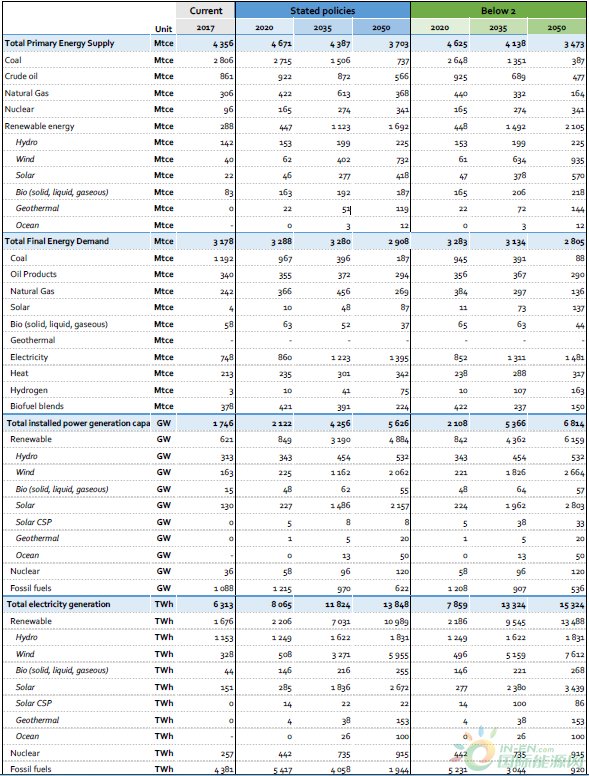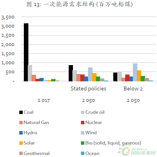 2050年的能源供应格局将由煤炭为主向多元化转变;低于2 °C情景中2050年的化石能源比例降至30%,既定政策情景中至45%(图13)。