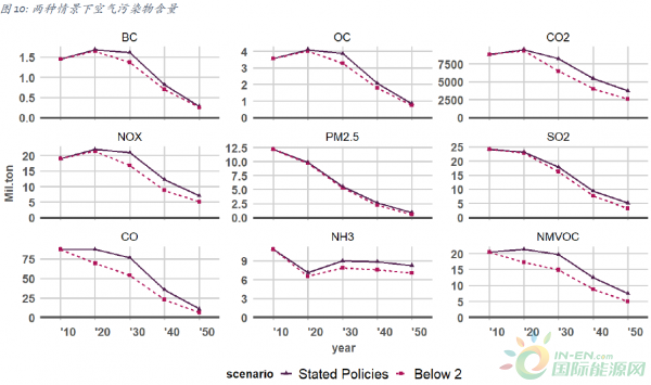 大部分空气污染物浓度在低于2 °C情景中下降程度更快。由于低于2 °C情景推行了更为激进的去煤化去油化政策,黑碳(BC),有机碳(OC),氮氧化物(NOx),一氧化碳(CO)以及非甲烷挥发性有机物(NMVOC)的含量在2035年就得到了显著控制。