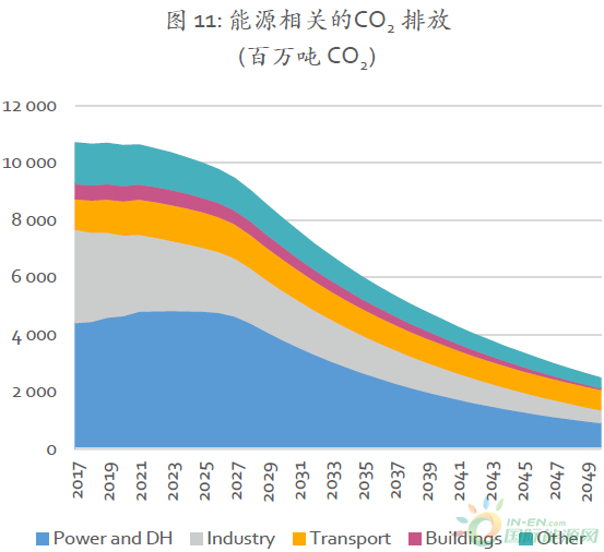 低于2 °C情景就中国对《巴黎协定》中温控目标的预期贡献,设计了2050年中国碳排放总量目标,并将基年与目标年的排放差距平滑摊到中间各年,制定了2017-2050逐年排放约束(图11)。在未来,受益于再电气化的深入,工业将成为最大的减排部门;尽管电力与热力需求翻倍,但由于能源技术升级,发电与供热部门的整体排放将大幅降低。