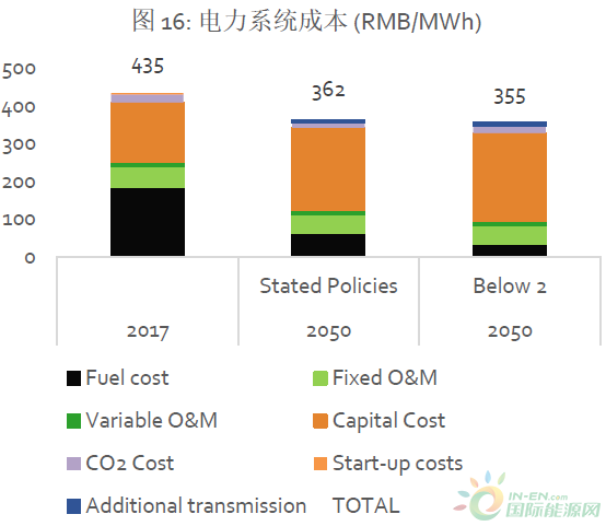 随着可再生能源技术成本快速下降、不经济的资产逐渐退出市场,未来的电力成本有可能降至比现在更低的水平。两种情景都预测了比现在更低的2050年供电成本(图16)。由于对CO2排放更严格的要求,低于2 °C情景中向可再生能源系统的转型也更快。总体看来,未来电力的燃料成本更低,但是基础投资和系统投资费用将增加。