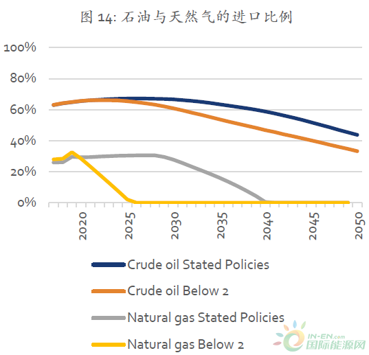 能源进口比例大幅缩减,其中低于2°C情景中天然气与石油的能源进口比例更少 ,而既定政策情景中两者的对外依存度相对较高,仍面临进口挑战 。(图14)
