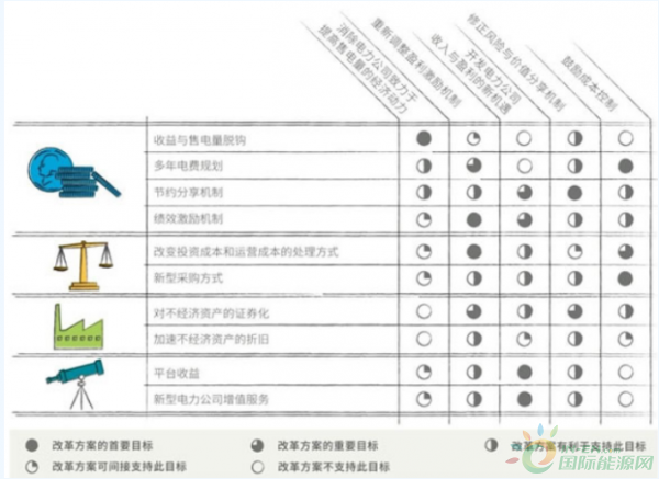 在目前正在进行的电力企业商业模式改革中,我们看到上述多项改革方案往往不是单一执行的,很多综合性的改革都是选择多项方案并举以强化改革效果。例如英国的RIIO(收入=奖励+创新+产出)模式中就同时采用了绩效激励、多年电费规划和节约分享机制等多项措施。因此,监管者和企业可以根据设定的规划目标,合理地选择和组合各类改革工具。(参见图表)