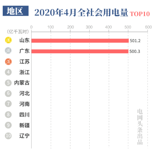 2020年4月份,山东、广东和江苏的全社会用电量位列全国前三甲,分别为501.2 亿千瓦时、500.3亿千瓦时和477.0 亿千瓦时。