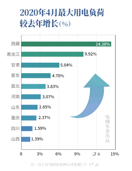 西藏、黑龙江、甘肃、蒙东、冀北、河南、山东、重庆、四川、山西电网最大用电负荷环比增幅位列前十。其中,西藏电网以14.38%的增速位居第一。源源不断的电能正加速送达西藏脱贫攻坚的现场。