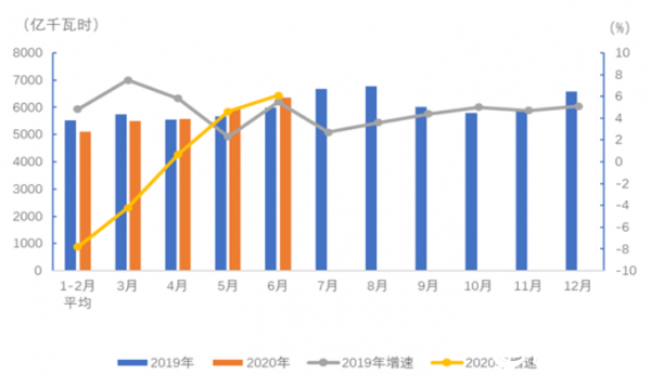 图1 2019、2020年分月全社会用电量及其增速
