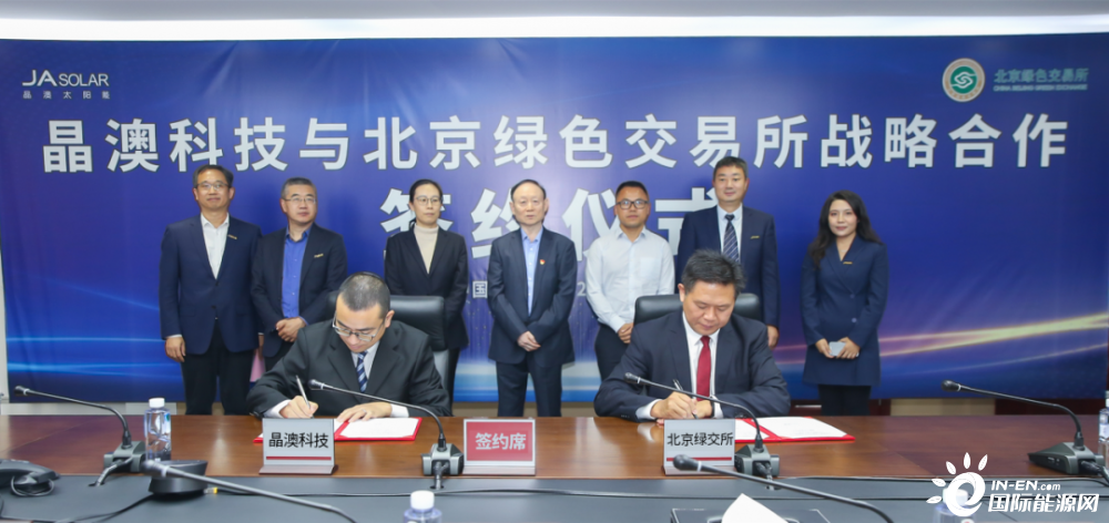 10月13日,晶澳科技与北京绿色交易所有限公司签署战略合作协议,晶澳科技董事长靳保芳出席签约仪式并见签,晶澳科技轮值总裁杨爱青、北京绿色交易所总经理梅德文分别代表双方签约。签约仪式前,双方进行了座谈,探讨我国碳市场面临的机遇和挑战。