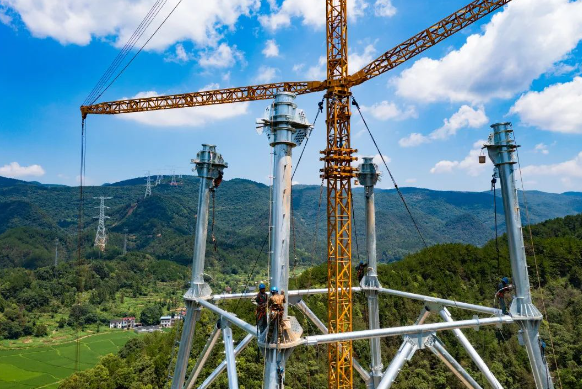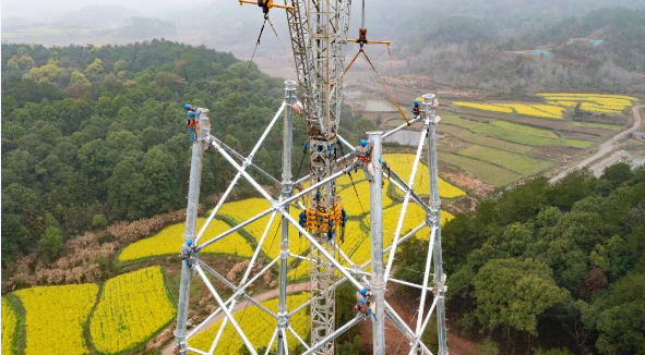 本工程将湖北电网与江西电网通过特高压输电通道相连,同时也是华中地区“日”字形网络的最后一笔,建成后将有效增强江西与湖北之间的网架联络,提升电力交换能力,有效支撑大规模绿色清洁能源的接入消纳,为江西乃至华中地区发展提供更可靠的电力支撑。赣1标段是江西境内唯一一个山区施工作业的标段,线路路径长2×39.8千米,新建铁塔93基,铁塔最重达341吨、最高达144米、部分塔横担长度达80.6米,全部采用落地双摇臂抱杆进行组塔。