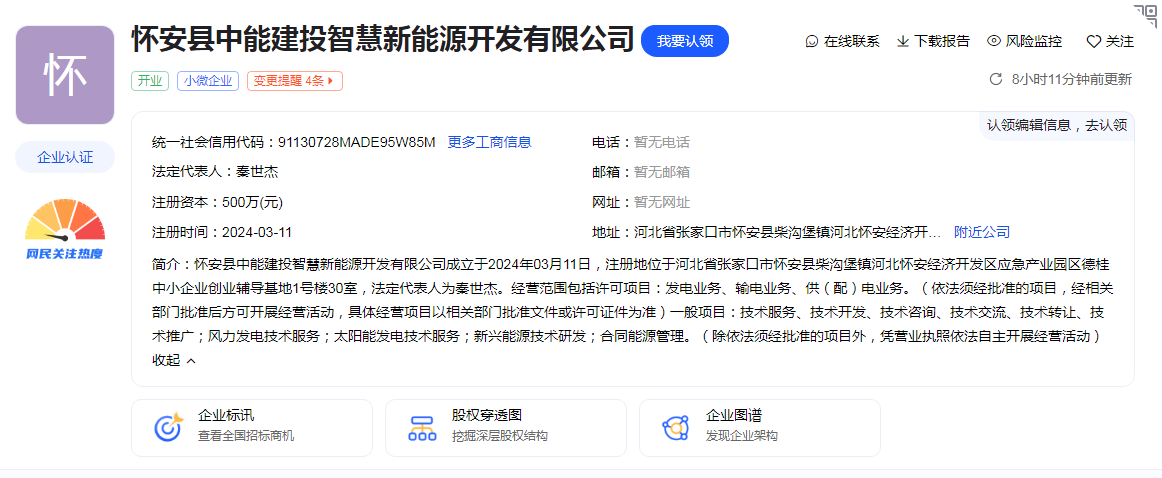 国际能源网获悉,近日,怀安县中能建投智慧新能源开发有限公司成立,注册资本500万元,经营范围含风力发电技术服务、太阳能发电技术服务、新兴能源技术研发、合同能源管理等。