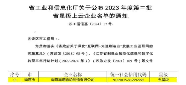近日,江苏省工业和信息化厅公布了2023年度第二批省星级上云企业名单,南京高速齿轮制造有限公司成功入选,并被评定为“五星级上云企业”。