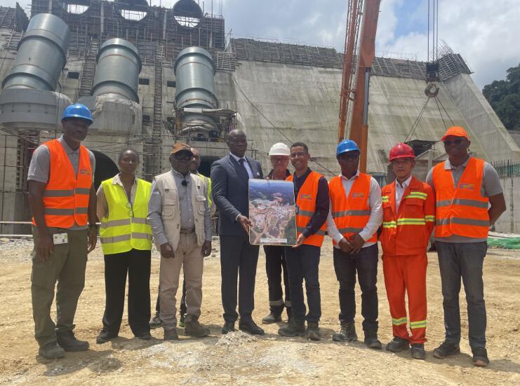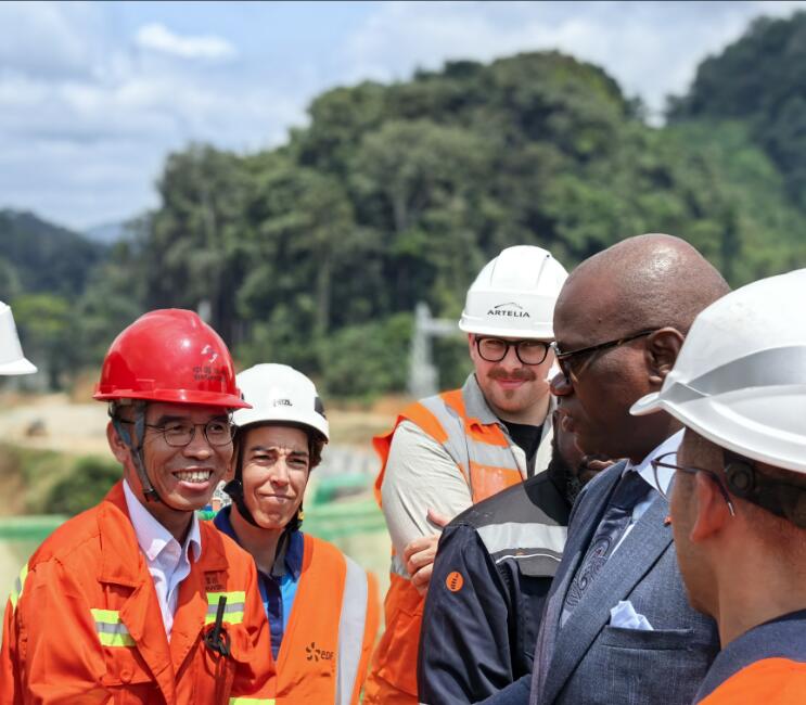 恩圭马总统一行参观了大坝施工区、电站厂房等区域,详细了解了工程进度、技术应用及质量管控等情况。恩圭马总统向一线建设者致以慰问,高度肯定了该项目对缓解加蓬首都利伯维尔大区当前电力供应压力、保障民生用电稳定以及推动经济社会发展的战略价值,并赞扬了中国电建在促进属地就业、带动中小企业参与国家重点工程方面做出的贡献。