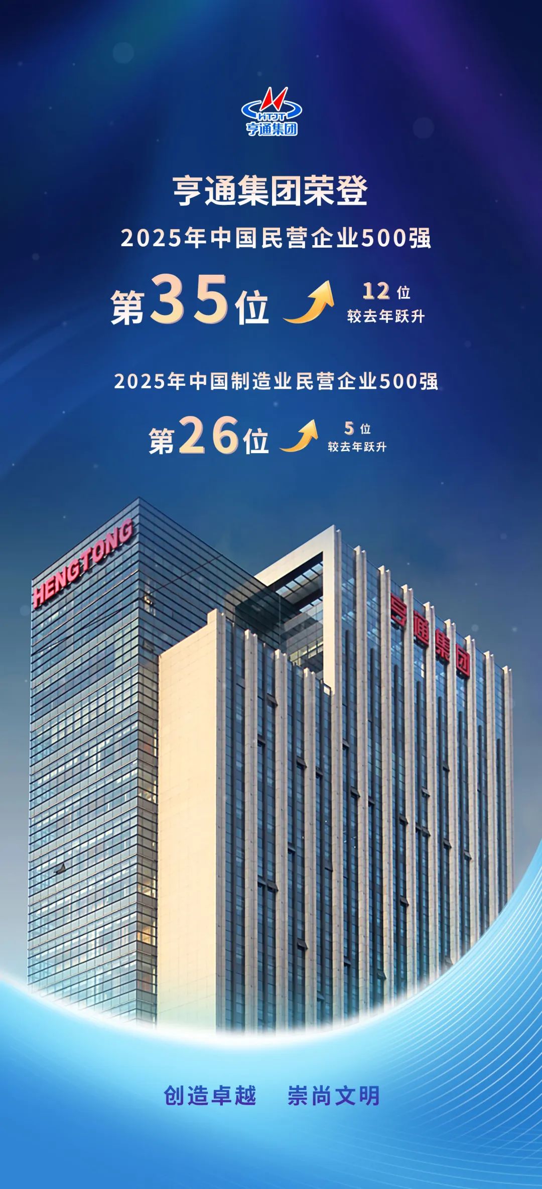 在发布的“2025中国民营企业500强”榜单中,亨通集团以1956亿元的营收位列第35位,相比去年提升12位,实现排名连年跃升。在同期发布的“2025中国制造业民营企业500强”中,亨通集团位列第26位,相比去年提升5位。