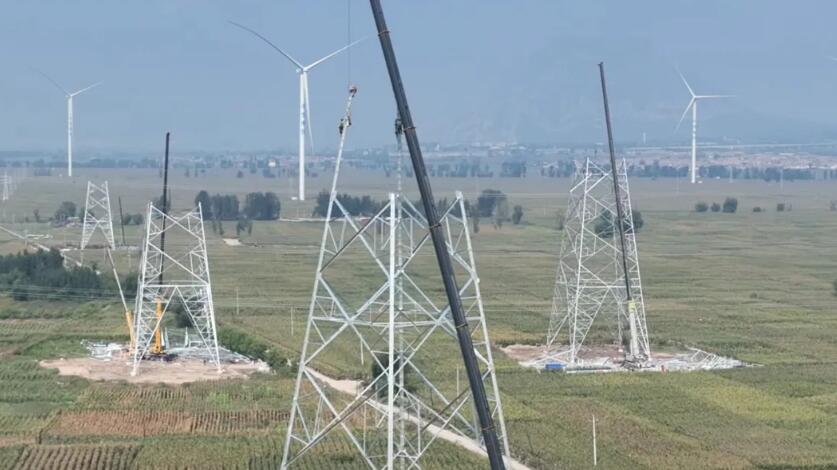 9月6日,由上海送变电工程有限公司承建的大同~天津南1000千伏特高压交流工程线路工程(冀3标)03L113号塔位现场,提前架线段首基铁塔成功组立。