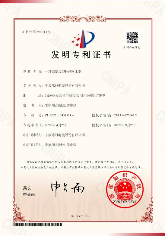 近日,由球冠电缆自主研发的“一种高聚风型拉丝吹水器”成功获得国家发明专利授权(专利号:ZL 2022 1 0437511.4)。截至目前,球冠电缆本年度已累计斩获8项国家专利授权,技术创新成果持续涌现。