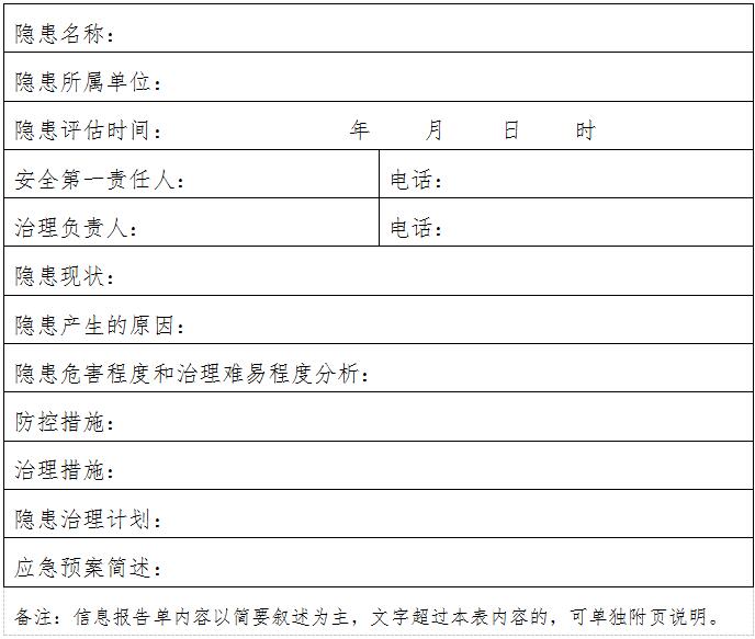 第十八条电力企业应当建立重大隐患报告制度,发现重大隐患应向国家能源局派出机构、地方电力管理部门报告,涉及水电站大坝安全的重大隐患应同时报送国家能源局大坝安全监察中心。重大隐患信息报告应当包括:隐患名称、隐患现状及其产生的原因、隐患危害程度和治理难易程度分析、隐患的治理计划等(详见附件)。
