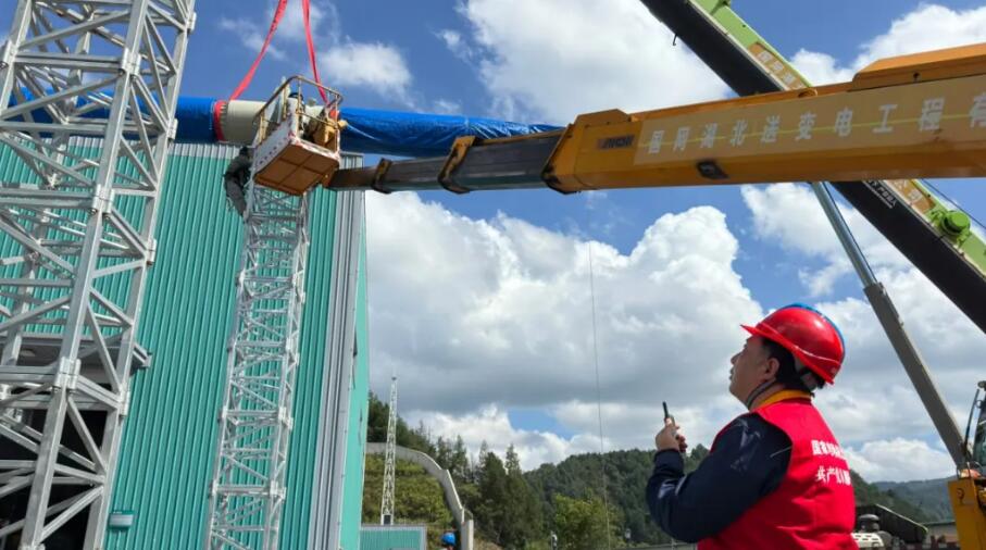 ▲现场施工人员对即将进行耐压试验的套管开展吊装作业