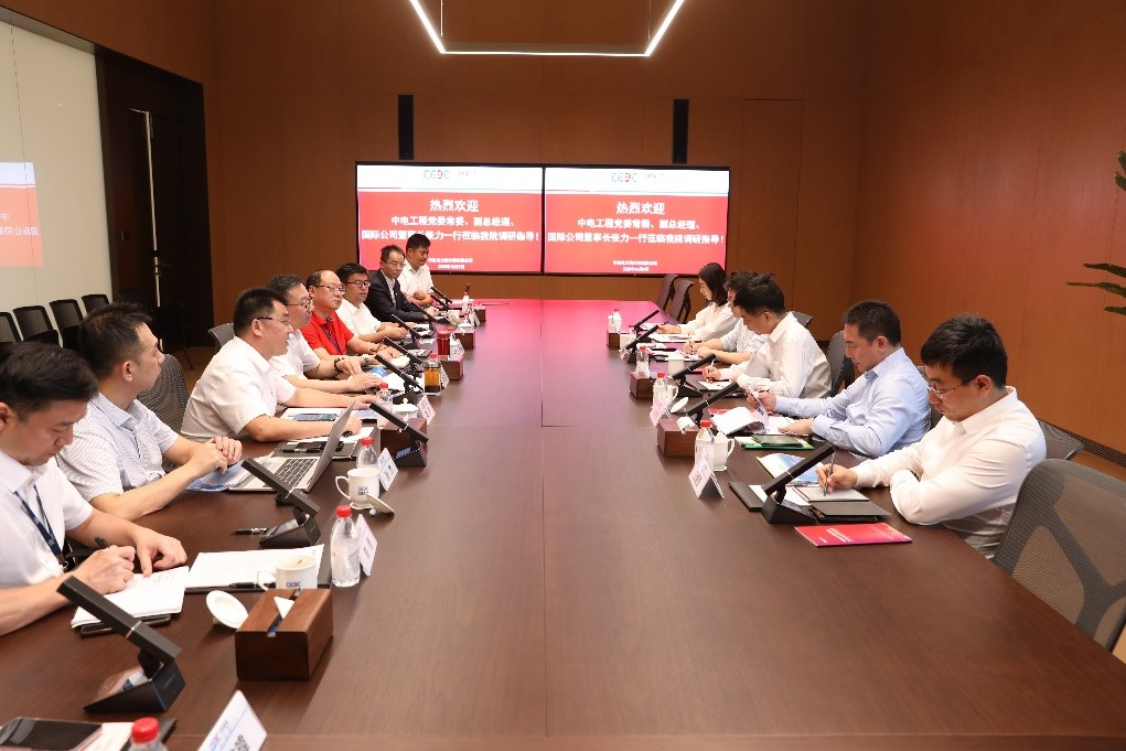 中电工程国际公司党委副书记、执行总经理、中电工程海外事业部总经理陈向东,华东院首席国际顾问,双方相关部门负责人参与交流。
