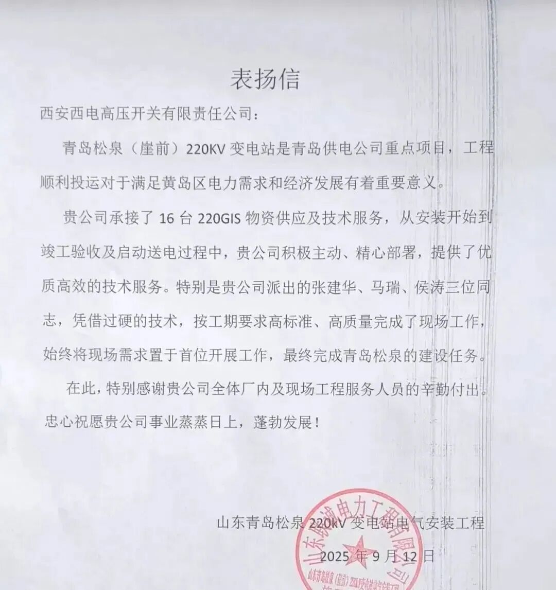 近日,由中国西电所属西开有限承建的国网山东青岛松泉(崖前)220kV输变电混气双断口工程顺利完成送电运行。该工程是西开有限直线隔离开关产品的首次工程实践,不仅实现了技术创新的重要突破,更以高效协同的项目执行力,展现了公司在电力装备领域的专业实力与使命担当。