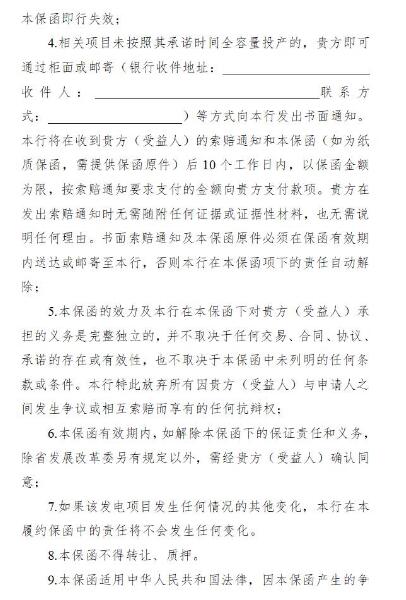 (二)履约保函。拟参与竞价的未投产项目(含未取得电力业务许可证项目)需向竞价组织机构提交履约保函(模板见附件4),已投产项目(需取得电力业务许可证)参与竞价的原则上不需提交保函。履约保函为银行出具的、向竞价组织机构开立的书面信用担保凭证,保函有效期为项目承诺投产时间1年后。