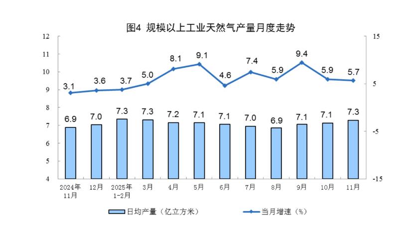 天然气生产稳定增长。11月份,规上工业天然气产量219亿立方米,同比增长5.7%;日均产量7.3亿立方米。