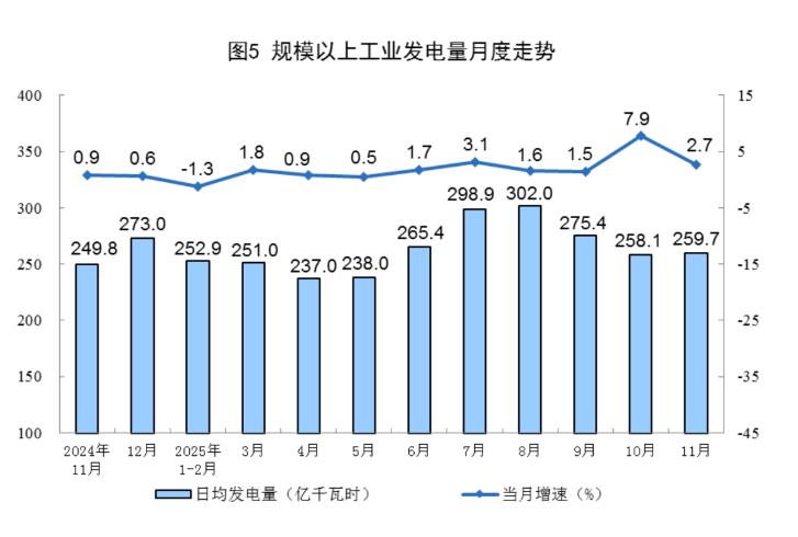 规上工业电力生产保持增长。11月份,规上工业发电量7792亿千瓦时,同比增长2.7%;日均发电量259.7亿千瓦时。1—11月份,规上工业发电量88567亿千瓦时,同比增长2.4%。