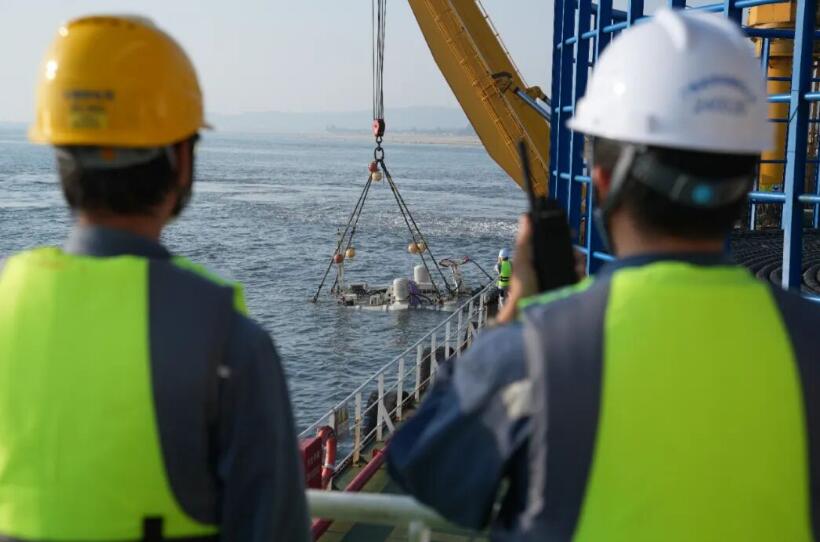 ▲2025年12月31日,220千伏涠洲岛跨海联网工程完成海缆敷设施工。图为海缆敷设船收起埋设犁,为甩缆做准备。(梁磊 摄)
