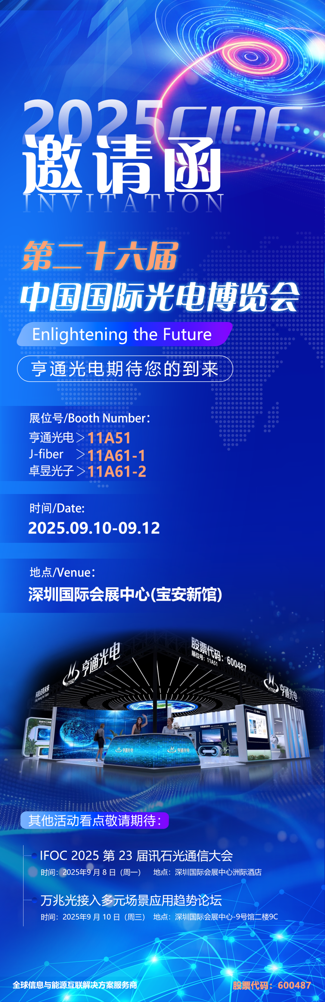 第二十六届中国国际光电博览会(CIOE中国光博会)将于2025年9月10—12日在深圳国际会展中心举办。届时,亨通光电将携特种光纤、高速光模块、AOC等核心产品及数据中心、工业通信与智联、FTTx、高密度连接等解决方案亮相本届展会。与您携手共同推进产业及行业的发展和进步!