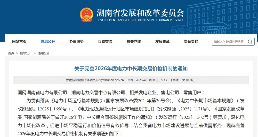 12月31日,湖南省发展和改革委员会发布《关于完善2026年度电力中长期交易价格机制的通知》,其中提到,优化中长期价格形成机制。2026年度全省电力中长期交易全面建立反映市场供需、发电成本变化等因素的灵活价格机制。市场主体在签订中长期交易合同时,不得强制要求签订固定价格。