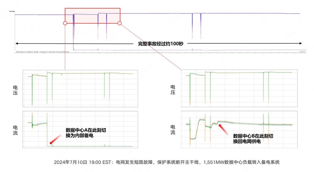 孙睿以全球AIDC发展的最前沿——北美弗吉尼亚州为例:2024年7月,一次电网短路故障导致该地区数十家数据中心共计1551MW负载同时脱网,电网因瞬间失去巨量负载而功率严重过剩,引发危险的暂态过电压与频率飙升,区域调度被迫紧急削减多座电厂出力,才勉强在7分钟内将电网恢复正常状态,避免更大的经济损失。类似事故在2025年2月再度上演。