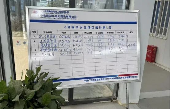 进度是项目履约的“时间赛道”,也是提升效益的“关键跑道”。走进中煤广元项目部大门,锅炉水压焊口统计表如同“进度仪表盘”,每日保持更新。负责统计工作的焊接专工每天都会准时到施工现场,与焊工沟通了解当天的焊接进度、认真填写表格并上报,一旦焊口完成进度滞后的情况,项目部将迅速组织技术人员攻关,调整焊接工艺,增加设备投入,尽快追赶进度。“进度仪表盘”让每一位施工人员都明确任务与目标,跑出了项目履约的“广元速度”。
